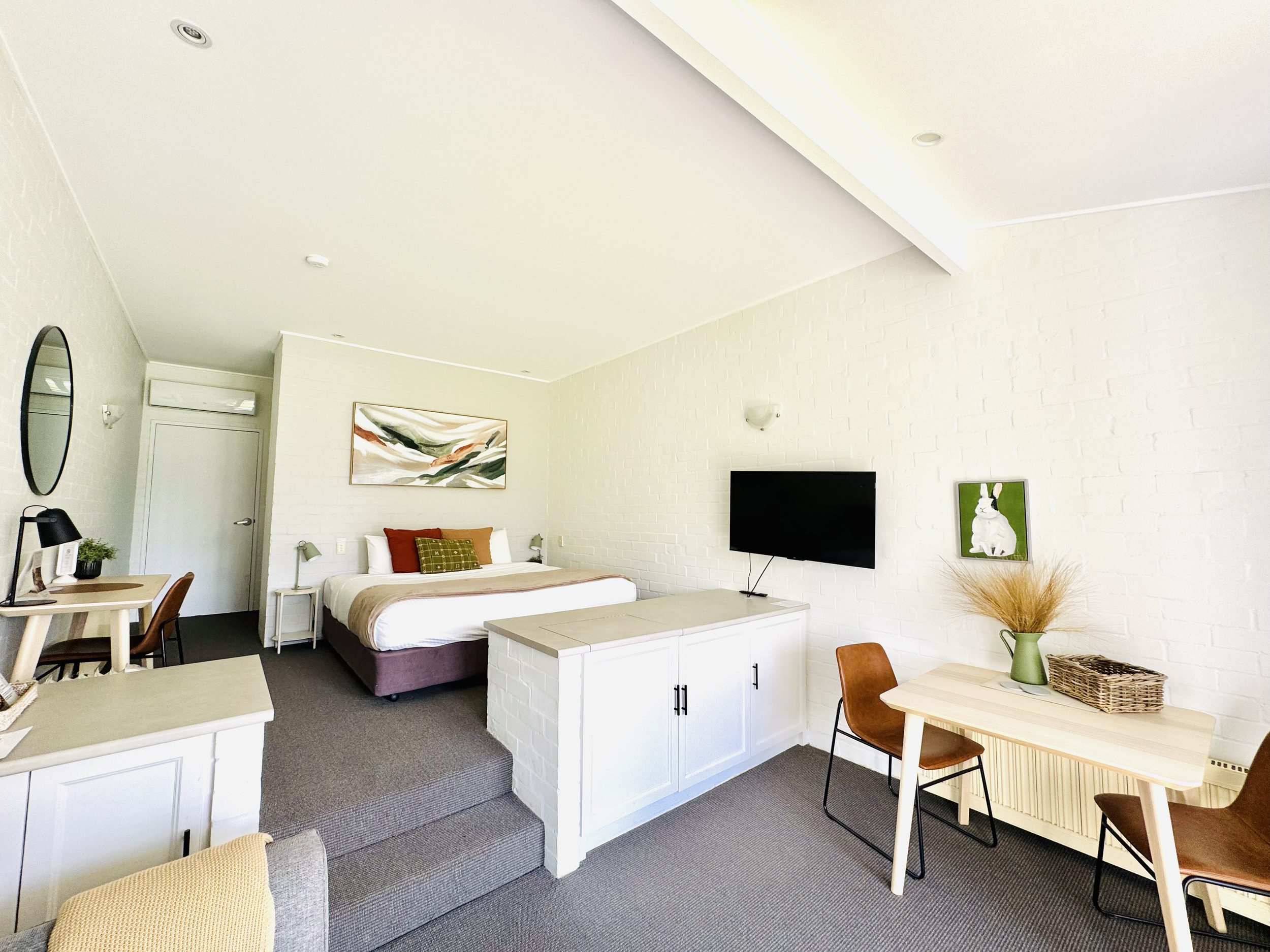 This room features a King bed or two King Single beds, daily housekeeping, free parking, air conditioning/heating, television, free wi-fi, Mini-bar and fridge, bathroom, dressing table, sofa bed lounge and complimentary boutique tea and coffee. All rooms have large French doors which allow guests direct access to our stunning country gardens and private lake. Breakfast is available at an additional charge.